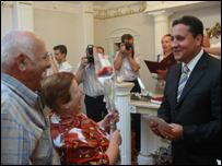 "Am emoţii. Aşa lucruri fără emoţii nu se fac. Emoţii pozitive", a declarat la BBC soţul Agripinei, Vladimir Furdui. Viceprimarul Chişinăului, Veaceslav Iordan, i-a felicitat şi el pe jubiliari şi a înmânat fiecărui cuplu câte 500 de lei, adică aproximativ 38 de dolari. E puţin, a spus viceprimarul, dar în prezent posibilităţile Primăriei sunt limitate. Veaceslav Iordan şi-a exprimat speranţa că pe viitor această sumă va fi majorată.