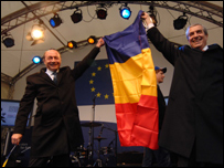 În orice caz, situaţia politică a României la puţin peste o lună de la aderarea la Uniunea Europeană este fără precedent: preşedintele ameninţat cu suspendarea, guvernul, rămas minoritar, ameninţat cu o moţiune de cenzură şi toate acestea la doar trei luni de la alegerile pentru Parlamentul European. În aceste condiţii, este îndoielnic că agenda legislativă obişnuită, dar extrem de importantă, va putea fi dezbătută în condiţii normale. Preşedintele Traian Băsescu a avertizat deja că România riscă declanşarea clauzei de salvgardare în justiţie, dacă Parlamentul nu adoptă de urgenţăşi într-o versiune severă Legea Agenţiei Naţionale de Integritate (ANI). ANI este o instituţie menită să verifice averile demnitarilor şi a fost cerută cu insistenţă de Uniunea Europeană. Declanşarea clauzei de salvgardare în justiţie ar avea ca efect, între altele, nerecunoaşterea de către UE a deciziilor justiţiei din România. Aşteptăm comentarii la [email protected] Încercarea disperată a unei părţi a clasei poltice de a-l înlătura pe Băsescu, este una de a opri schimbările majore, acţiunile acestuia fără precedent, şi anume : 1) Sprijin pentru numirea unui ministru de justiţie independent, pentru reformele acestuia: proiecte de legi anticorupţie; 2) Aprobarea bazei militare a SUA în România; 3) Eliminarea ministrului PNL şi dizident al apărării; 4) Menţinerea trupelor în Irak; 5) Atenţionarea asupra acţiunii păguboase ale "băieţilor deştepţi" în distribuirea energiei elctrice; 6) Atenţionarea asupra posibilităţii infiltrării oligarhiei ruse în exploatarea resurselor energetice româneşti; 7) Scoaterea dosarelor Securităţii; 8) Înfiinţarea Comisiei Tismăneanu şi condamnarea oficială a regimului comunist; 9) O critică permanenta al guvernului condus de Tăriceanu şi cererea repetată de alegeri anticipate; 10) Diponibilizarea lui Stolojan, care înfiinţează cu Stoica PLD; 11) Acţiuni pe plan intern şi extern pentru aderarea României la UE şi reuşita; Ca urmare a punctelor 1-11,rezultă păcatul de NEIERTAT :12) De a fi cel mai agreeat politician din România! Nu există în România o instituţie care adăposteşte atâta impostură. Corect s-a spus că este "puroiul" ţării. Câte bube o avea Băsescu, dar credeţi că putem rata o asemenea ocazie să dăm o palmă binemeritată clasei politice actuale? Sunt aceiaşi de 17 ani care sub diferite denumiri se rotesc şi fac cum fac şi tot acolo ajung. | LEGĂTURI Consultări privind suspendarea preşedintelui01 Februarie, 2007 | Ştiri Modificări la Legea referendumului30 Ianuarie, 2007 | Ştiri Ce este suspendarea din funcţie a Preşedintelui României21 Ianuarie, 2007 | Ştiri LEGĂTURI LA SITE-URI EXTERNE BBC nu este răspunzător de conţinutul paginilor de Internet ce nu îi aparţin | |||||||||||||||||||||||||||||||||||||||||||
