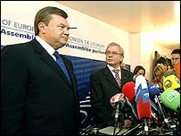 Preşedintele Ucrainei nu este singurul care a pornit într-o ofensivă de imagine pe plan european. Principalul său adversar, premierul Viktor Ianukovici, nu s-a lăsat mai prejos şi a ţinut un discurs în faţa Adunării Parlamentare a Consiliului Europei. Premierul Ianukovici a evocat la Strasbourg posibilitatea suspendării din funcţie a preşedintelui Iuşcenko, în cazul invalidării decretului de dizolvare a Radei Supreme. În tot acest timp la Kiev demonstranţi din ambele tabere s-au adunat în faţa Curţii Constituţionale. Curtea a început dezbaterile pe tema constituţionalităţii decretului de dizolvare a parlamentului emis de preşedinte. O decizie este aşteptată cel mai devreme la începutul lunii viitoare iar în perioada în care cei 18 judecători vor delibera se aşteaptă să fie foarte tensionată. Acum o săptămână, cinci dintre ei s-au plâns în public de presiunile cărora au fost obligaţi să le facă faţă din momentul în care Curtea a fost sesizată cu privire la controversatul decret de dizolvare a parlamentului. | LEGĂTURI Iuşcenko dispus la compromis cu privire la alegeri11 Aprilie, 2007 | Ştiri Curtea Constituţională din Ucraina - 'sub ameninţare'10 Aprilie, 2007 | Ştiri Premierul Ucrainei cere Austriei să medieze criza politică06 Aprilie, 2007 | Ştiri În Ucraina, criza politică ia amploare04 Aprilie, 2007 | Ştiri Impas politic total în Ucraina04 Aprilie, 2007 | Ştiri Preşedintele Ucrainei dizolvă Parlamentul 02 Aprilie, 2007 | Ştiri LEGĂTURI LA SITE-URI EXTERNE BBC nu este răspunzător de conţinutul paginilor de Internet ce nu îi aparţin | |||||||||||||||||||||||||||||||||||||||||||