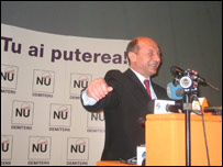 Un capitol important din program este cheltuirea fondurilor europene, mai ales sprijinirea fermierilor pentru întocmirea de proiecte care să fie finanţate din aceşti bani. De asemnea, reabilitarea sistemului de irigaţii, pentru evitarea unor crize precum cea actuală, determinată de secetă. Programul lui Traian Băsescu mai prevede începerea în 2008 a lucrărilor la aşa numitul coridor european IV, autostrada Nădlac - Deva - Sibiu - Piteşti, iar în 2009 modernizarea reţelei feroviare pe acelaşi traseu. La capitolul energie, programul susţine reducerea dependenţei de importurile de gaze şi ţiţei. În fine, programul de politică externă se referă la respectarea angajamentelor luate privind participarea la operaţiuni militare în Irak, Afganistan sau Balcani, continuarea parteneriatului cu Statele Unite, participarea activă la procesul politic european şi sprijinirea aspiraţiilor europene ale cetăţenilor din Republica Moldova. | LEGĂTURI Traian Băsescu e 'Cel mai perfect ipocrit şi populist'16 Mai, 2007 | Ştiri 'După referendum, ori democraţie, ori oligarhie'07 Mai, 2007 | Ştiri Traian Băsescu despre coaliţia antiprezidenţială07 Mai, 2007 | Ştiri LEGĂTURI LA SITE-URI EXTERNE BBC nu este răspunzător de conţinutul paginilor de Internet ce nu îi aparţin | |||||||||||||||||||||||||||||||||||||||||||
