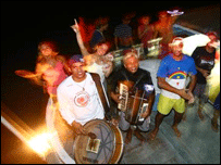 Probabil că asta se poate întâmpla doar în Brazilia. Spre 10 seara căpitanul a întors brusc vaporul din drum. S-a apropiat de unul dintre maluri, unde o altă barcă îi ceruse ajutor. Cei de acolo rămăseseră fără benzină. Aşa că echipajul nostru a umplut rapid două butoaie, pe care le-a dat celor rămaşi în pană. Barca era în drum către Parintins, dar oamenii s-au rătăcit şi au rămas fără combustibil. Vaporul în pană arăta ca una dintre zecile de bărci de lemn din Amazon. Cu două punţi, scorojit, înghesuit, el adăpostea câteva zeci de oameni. Pe acoperişul punţii superioare două fete îşi pregătiseră paturile pentru culcare. Lumea nu părea însă foarte îpreocupată că avea să-şi petreacă noaptea în mijlocul pustietăţii. Ba chiar erau destule zâmbete. Iar după cinci minute de sporovăială de pe-o punte pe alta, parcă eram prieteni de-o viaţă. Întâmplarea face ca cei pe care i-am scos din necaz sa fie o formaţie de muzică şi dansuri populare, Banda Gemido. Nu le-a trebuit mult să-şi intre în mână. După cinci minute s-au adunat cu toţii pe puntea din spate şi au inceput concertul, iar fetele s-au apucat de dansat. Samba, poate nu ca la marile şcoli, dar trăită din plin, oricum. Totul pe un spaţiu de doar 5 metri pătraţi. Aşa că am avut parte de o petrecere de 30 de minute cu cele mai populare cântece braziliene. Au fost şi câteva la cerere. Colegii noştri de la secţiile braziliană şi portugheză au ştiut ce să aleagă. O tobă şi un acordeon au acompaniat un cor de fete şi băieţi, cărora li s-au alăturat cunoscătorii de portugheză de pe vapor. O să punem pe aceasta pagină şi înregistrarea, ca să auziţi cum a fost. Trebuie sa ignoraţi însă zgomotul motoarelor, caci marinarii nu au mai avut răbdare. Sper să putem alătura şi unul dintre cântecele lor. Ne-au dat două discuri înainte de a ne despărţi, în urale. Colegii de la secţia indiană sunt probabil sunt cei mai fericiţi, pentru că au prins toată povestea în direct. Ei au plecat spre Parintins, noi spre ... Final neasteptat