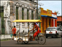 Am făcut turul oraşului într-un triciclu, un soi de ricşă locală, împinsă de un biciclist. Numai ca partea din faţă e mai curând un cărucior cu care se transportă la noi diverse obiecte. Meserie grea, mai ales dacă trebuie să duci doi oameni. Şi cel care ne-a dus pe noi vrea să plece, la o mină de aluminiu dintr-un stat vecin. Nu-i ajung banii decât în perioada de festival. Îl cheamă Uanderjohn, care ar veni din englezescul Wonder John: Ion Minune. Nu trebuie să vă mire. Lumea mai săracă din Brazilia are obiceiul să-şi boteze copiii după filmele americane. De exemplu, pe bucătarul nostru îl cheamă Washington. E un nume atât de popular încât îl poartă numeroşi brazilieni. Există însă cazuri în care se folosesc nume de parfumuri. Sau de medicamente, cum ar fi Caffeaspirina, care e un energizant local. Cele mai populare rămân totuşi binecunoscutele Joao, Maria si Antonio. Carnavalul nostru exclusiv