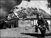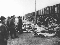 “Undeva aici este familia mea, spune Mihail Zaslavski. Am simţit o lovitură grozavă în spinare, iar fratele meu de 5 ani, pe care-l duceam în spate a fost despărţit de mine. Am fost separaţi - bărbaţii de femei, am fost puşi în barăci şi s-a dat foc. În baraca în care eram eu, acoperişul s-a lăsat şi s-a făcut o deschizătură… împreună cu vreo 30-40 de inşi, am luat-o la fugă, pe câmp…Mulţi au murit sub gloanţe. Eu am scăpat cu viaţă.” A fost ultima oară când şi-a mai văzut familia. Magaziile au fost ciuruite cu focuri de armă, udate cu gazolină şi incendiate, cu excepţia uneia care, pentru simetrie, a fost aruncată în aer.
