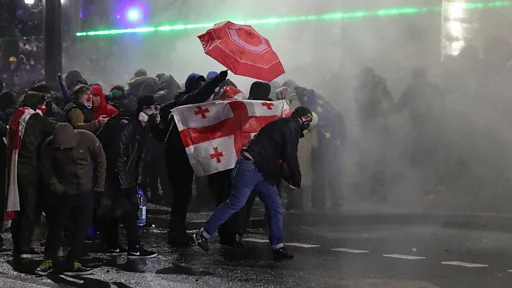 В Тбилиси в пятницу вечером и ночью продолжились протесты против решения правительства страны приостановить переговоры о вступлении в Евросоюз. Сообщается, что второй день подряд произошли стычки с полицией и жесткие задержания, полицейский спецназ оттеснил протестующих от здания парламента Грузии, используя водометы и, как сообщают СМИ, и слезоточивый газ.