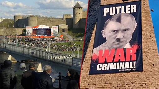 В четыре утра на башне Нарвского замка появился плакат с надписью «Putler war criminal» («Путин — военный преступник») и портретом российского президента Владимира Путина, соединенным с лицом Гитлера.