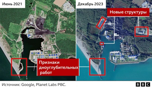Аналитическая телепередача Би-би-си Newsnight и отдел верификации Би-би-си Verify проанализировали спутниковые снимки, которые показывают, что после полномасштабного вторжения России в Украину в феврале 2022 года в порту Очамчиры были проведены дноуглубительные и строительные работы.