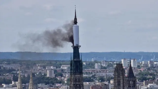 Шпиль готического собора во французском городе Руан в Нормандии загорелся во время ремонтных работ в четверг.