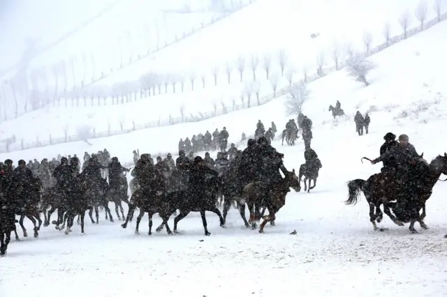 Подобно поло, участники соревнуются верхом на лошадях. Но вместо мяча они пытаются отбить друг у друга 30-40-килограммовую тушу козла или барана.