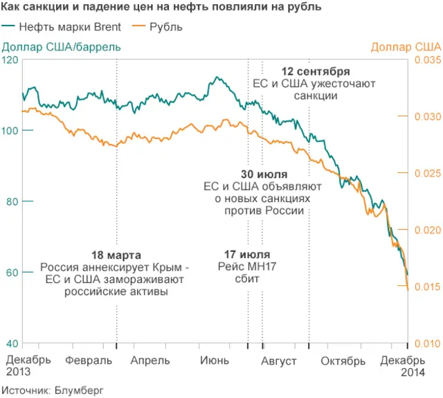 "По нашим оценкам, в 2015 году при ценах на нефть на уровне 80 долларов за баррель можно ожидать сокращения ВВП на 3-4%. Точно сказать сложно - многое будет зависеть от того, насколько быстро будут сняты санкции", - говорит в интервью Русской службе Би-би-си главный экономист URALSIB Capital Алексей Девятов.