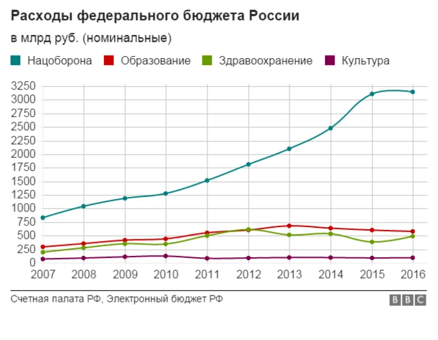 Видно, что социальные расходы в России растут практически синхронно с военными, за исключением 2014 года, когда первые немного просели. Таким образом, можно сделать вывод, что России в последние годы, как при Владимире Путине, так и в четырехлетку президентства Дмитрия Медведева придерживалась одной и той бюджетной стратегии - той, против которой <link type="page"><caption> протестовал</caption><url href="http://www.bbc.com/russian/business/2015/11/151122_kudrin_auzan_military_industry.shtml" platform="highweb"/></link> бывший министр финансов Алексей Кудрин, говоривший о чрезмерно раздутом военном бюджете.