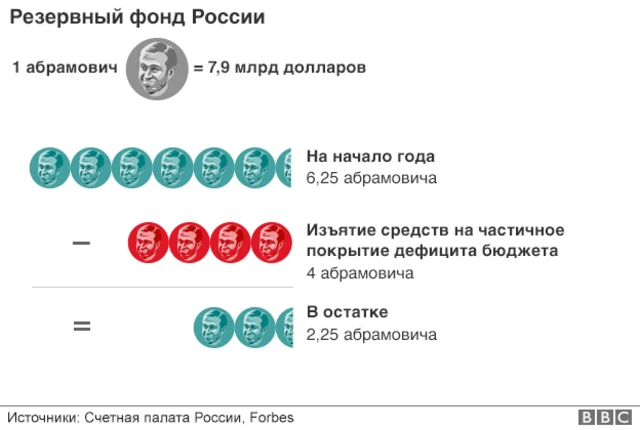 Но где же российское правительство возьмет недостающие абрамовичи? Для этого властям придется залезать в Резервный фонд, откуда планируется изъять 2,136 трлн рублей (31,04 млрд долларов), или 4 абрамовича (оставшиеся средства предлагается компенсировать за счет государственных ценных бумаг, доходов от приватизации и других источников). Учитывая, что на 1 января в Резервном фонде будет 6,25 абрамовича, то на конец года останется чуть более 2 абрамовичей.