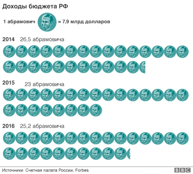Доходы федеральной казны в 2014 году составили 14,5 трлн рублей. Если переведем эту сумму в миллиарды долларов и поделим на 7,9, то получим 26,5 абрамовичей. Произведя аналогичные расчеты для 2015-го и 2016 годов, увидим, что в текущем году доходы казны сократились сразу на 3,5 абрамовича. В следующем году ожидается увеличение государственных закромов до 25,2 абрамовичей. Но это по-прежнему меньше уровня 2014 года.