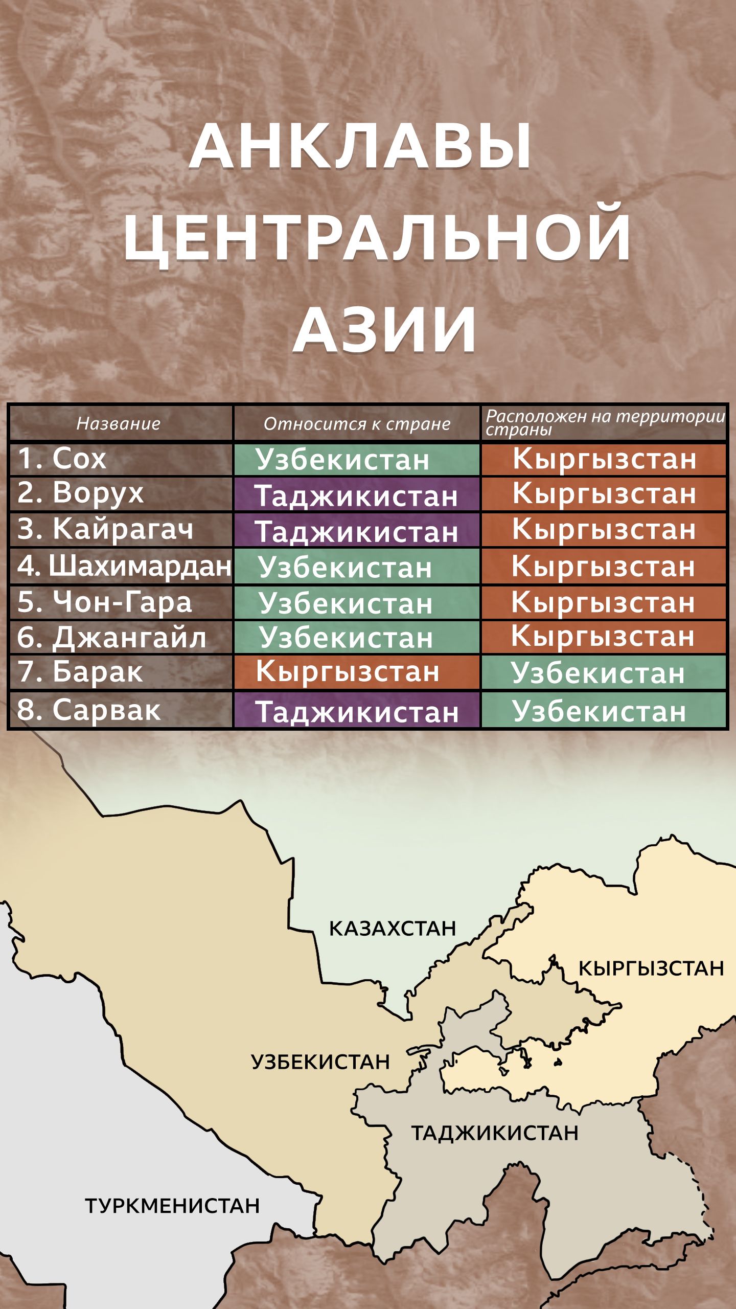 Они оба окружены Кыргызстаном, но в обоих живут этнические таджики, причем в Ворухе они граждане Таджикистана, а в Сохе - граждане Узбекистана.