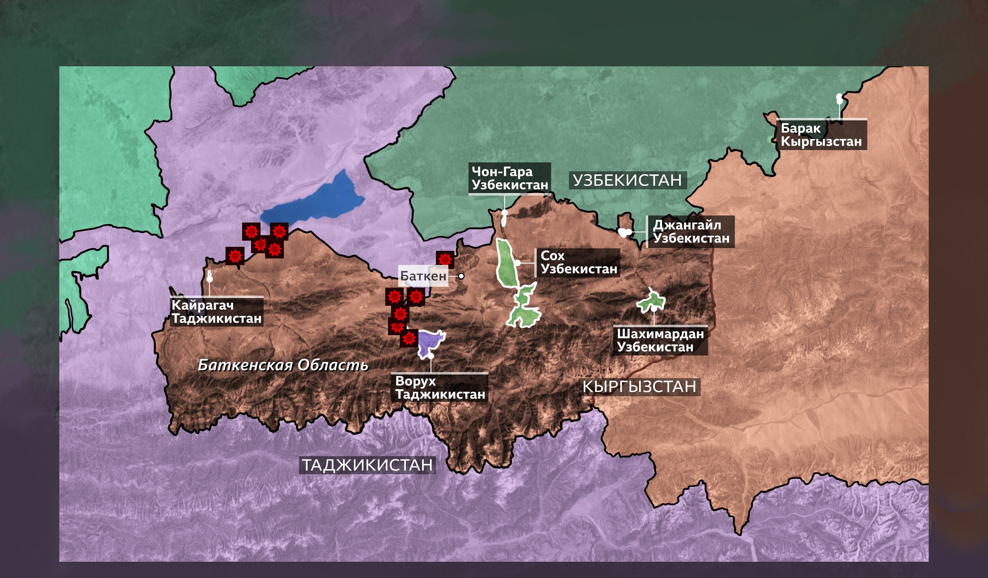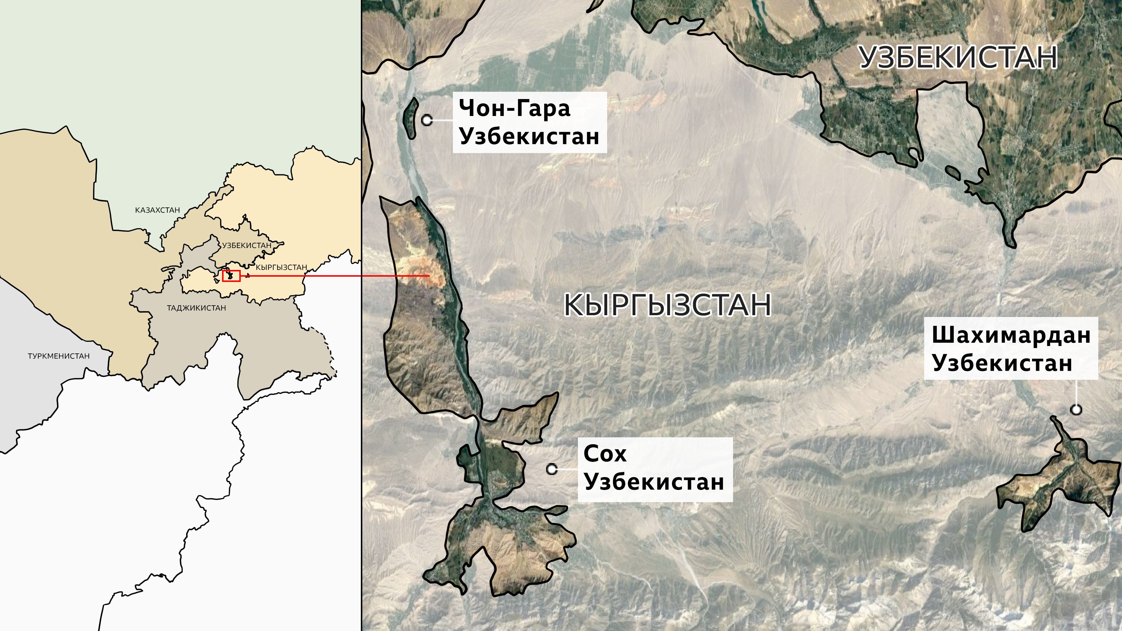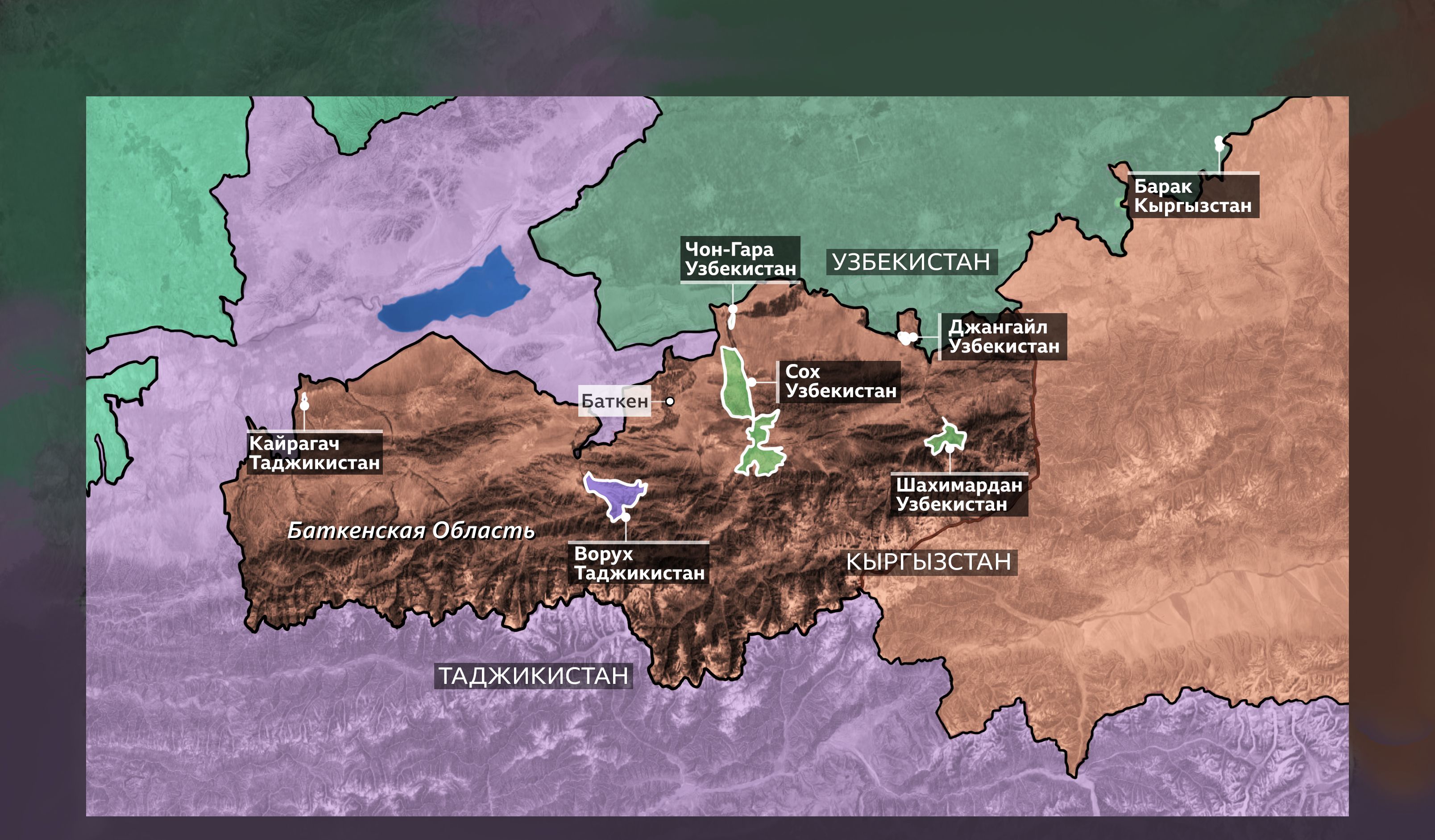 Самая напряженная обстановка складывается там, где границы все еще не согласованы - это крупнейшие и самые густонаселенные анклавы в Баткенской области Сох (80 тысяч человек) и Ворух (35 тысяч).