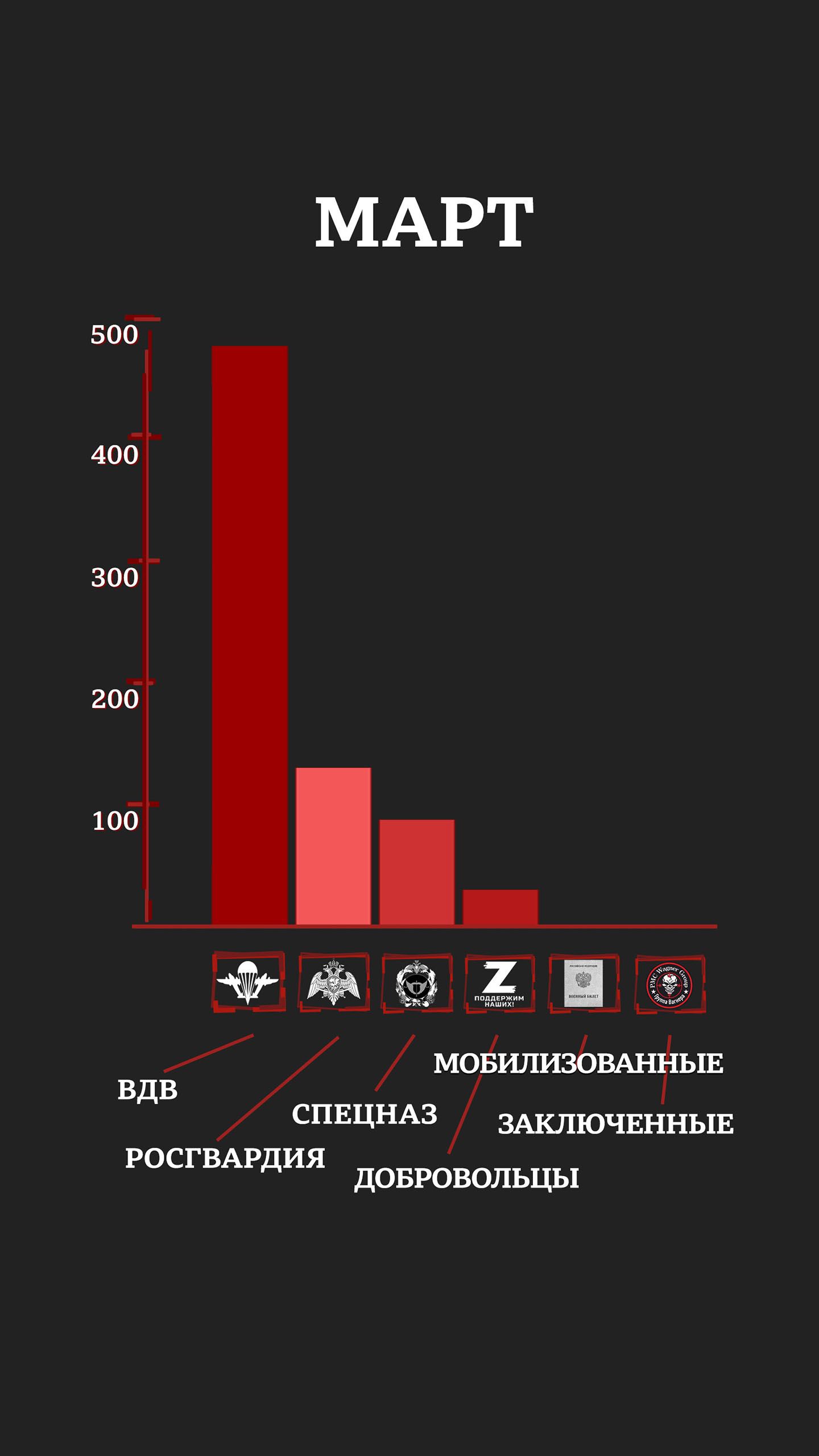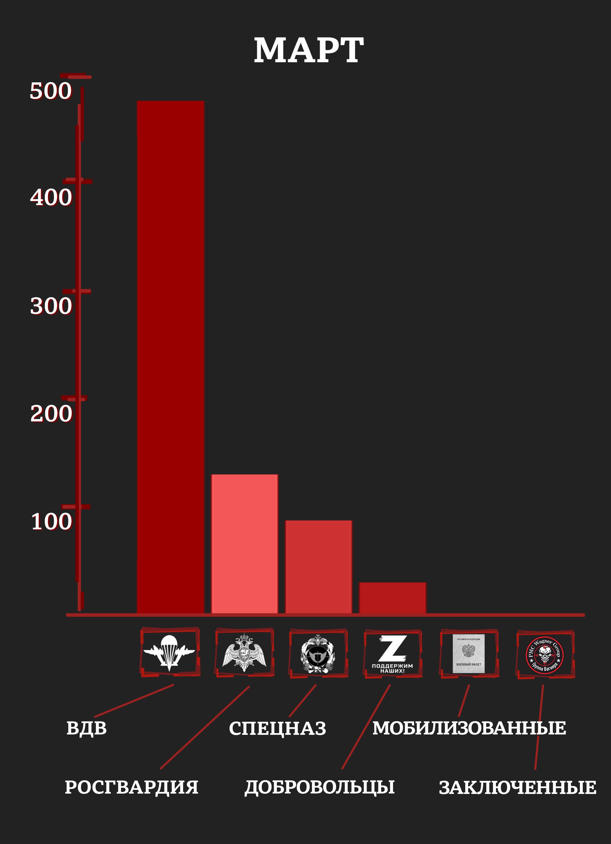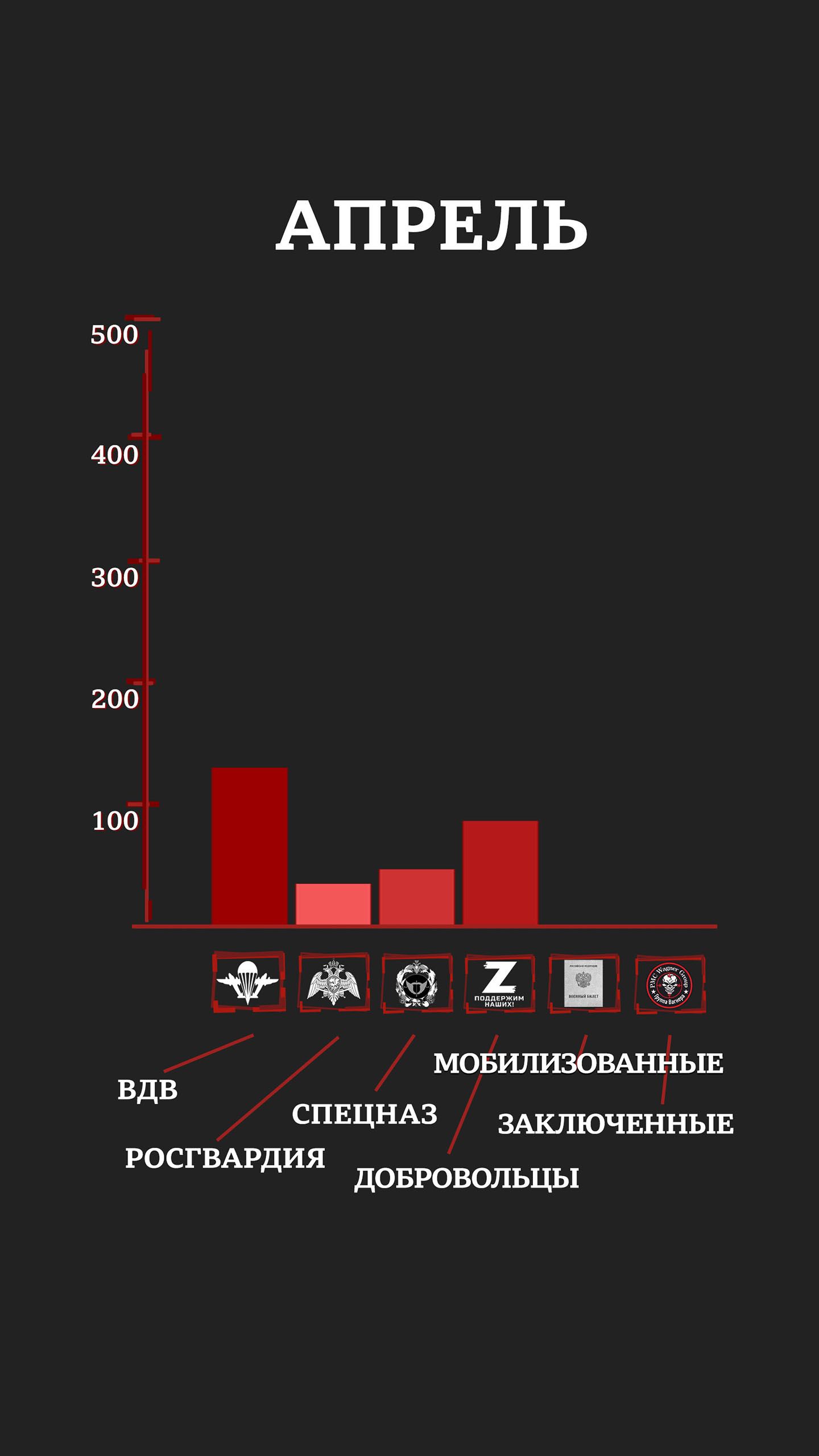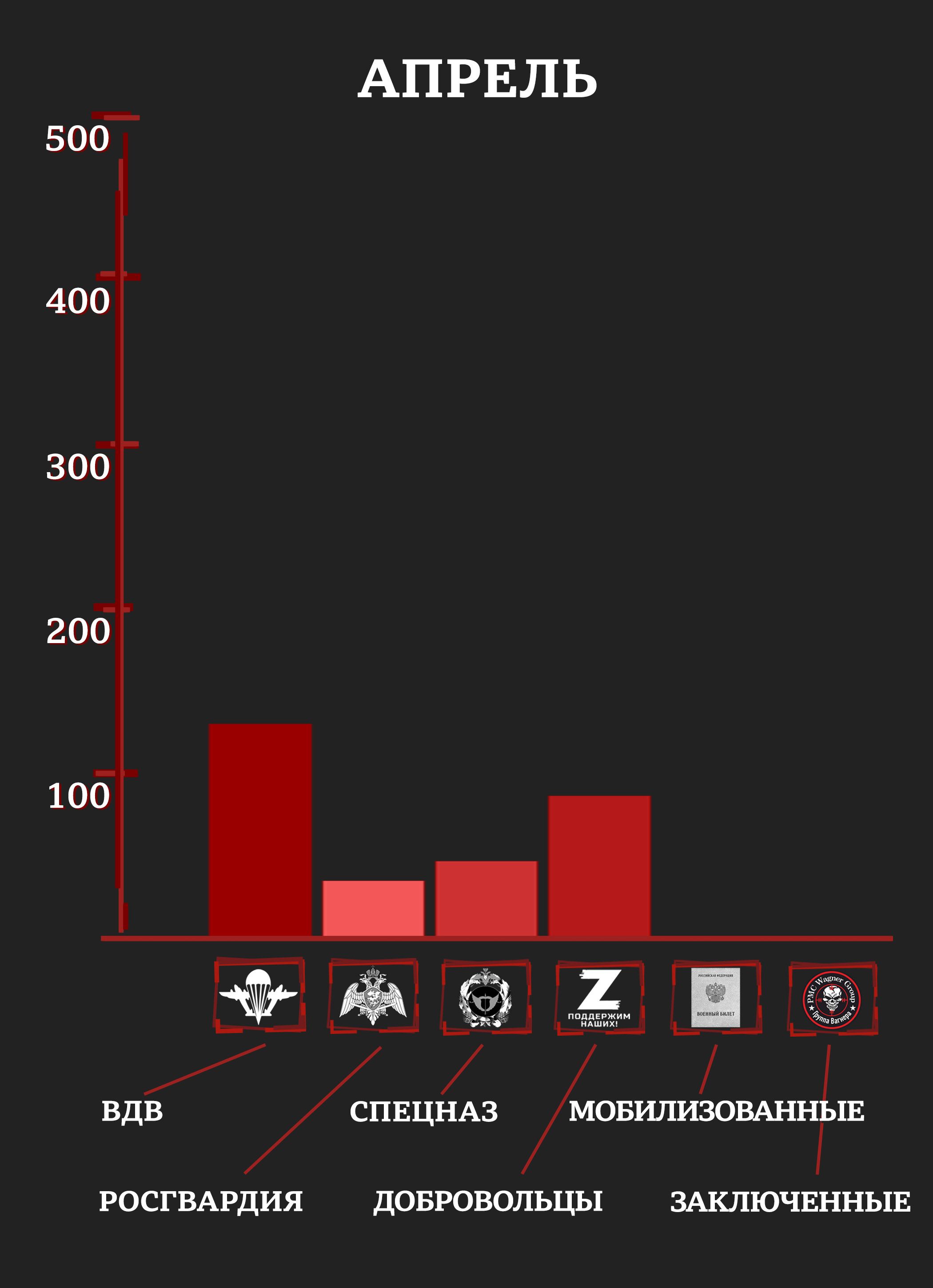 С учетом раненых и пропавших без вести уже к маю элитные отряды российской армии и Росгвардии имели в строю лишь четверть своего февральского состава (исходя из оценок специалистов и публиковавшейся численности отрядов). Средний возраст погибших в первые месяцы войны был 20-25 лет.