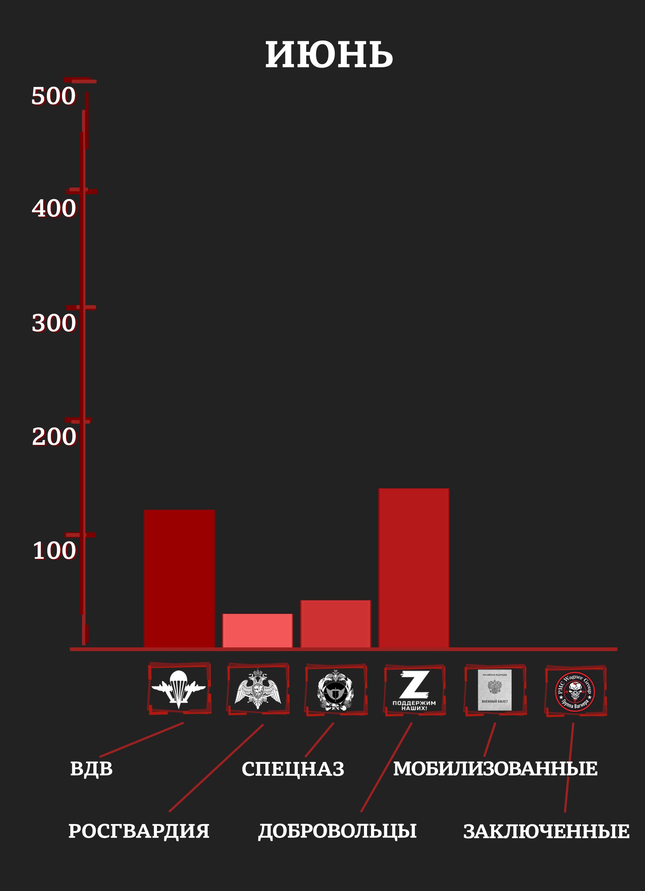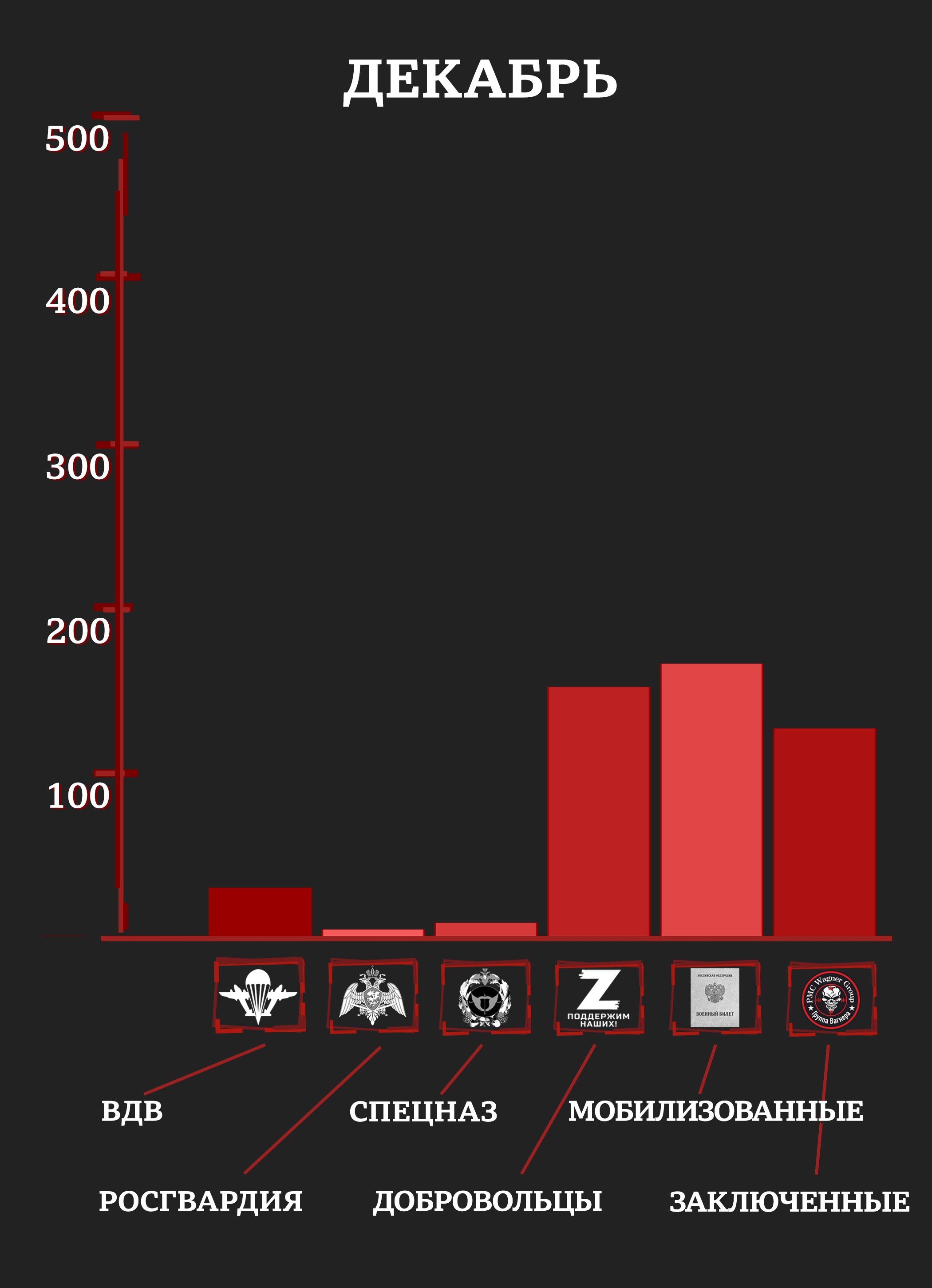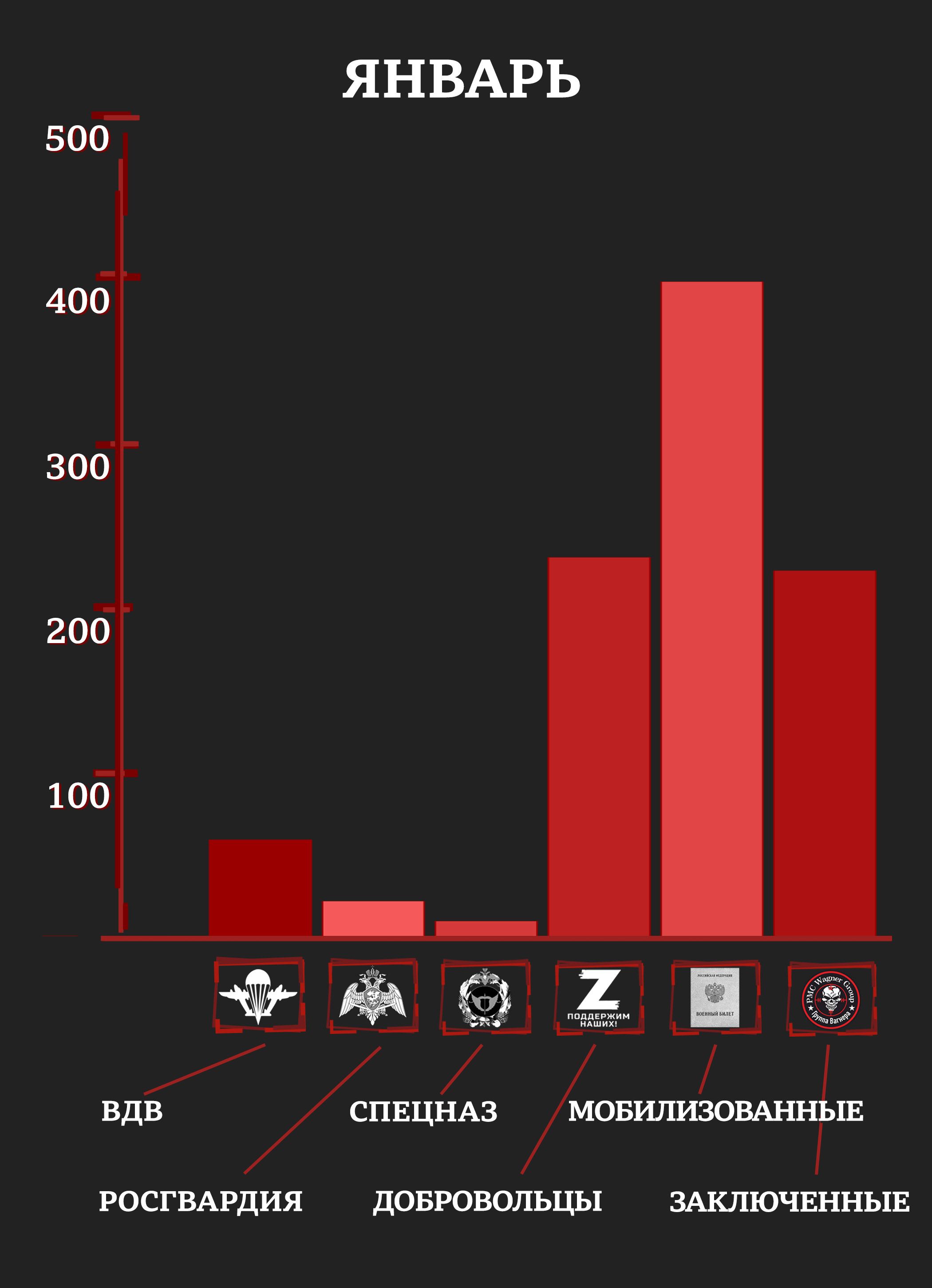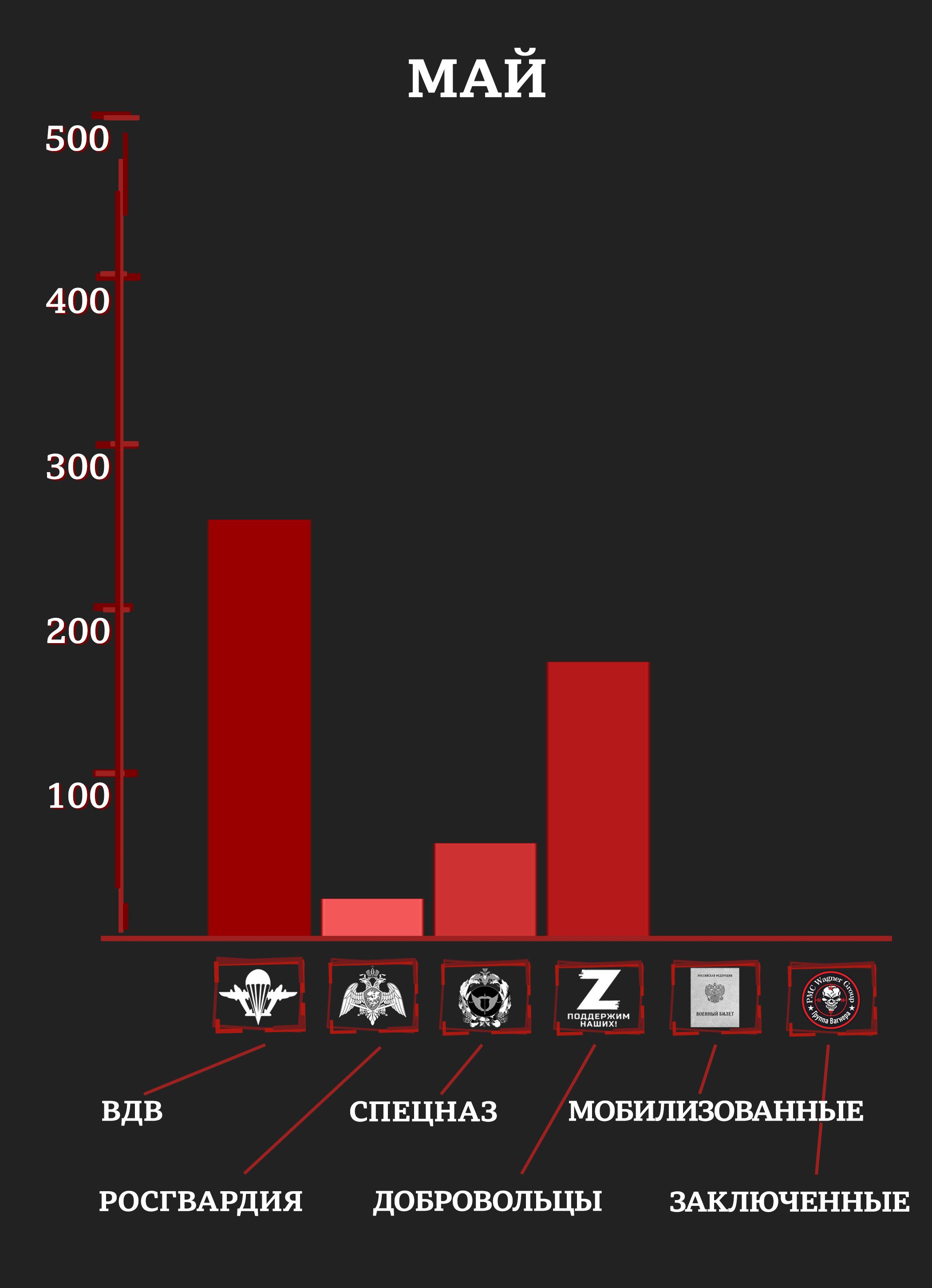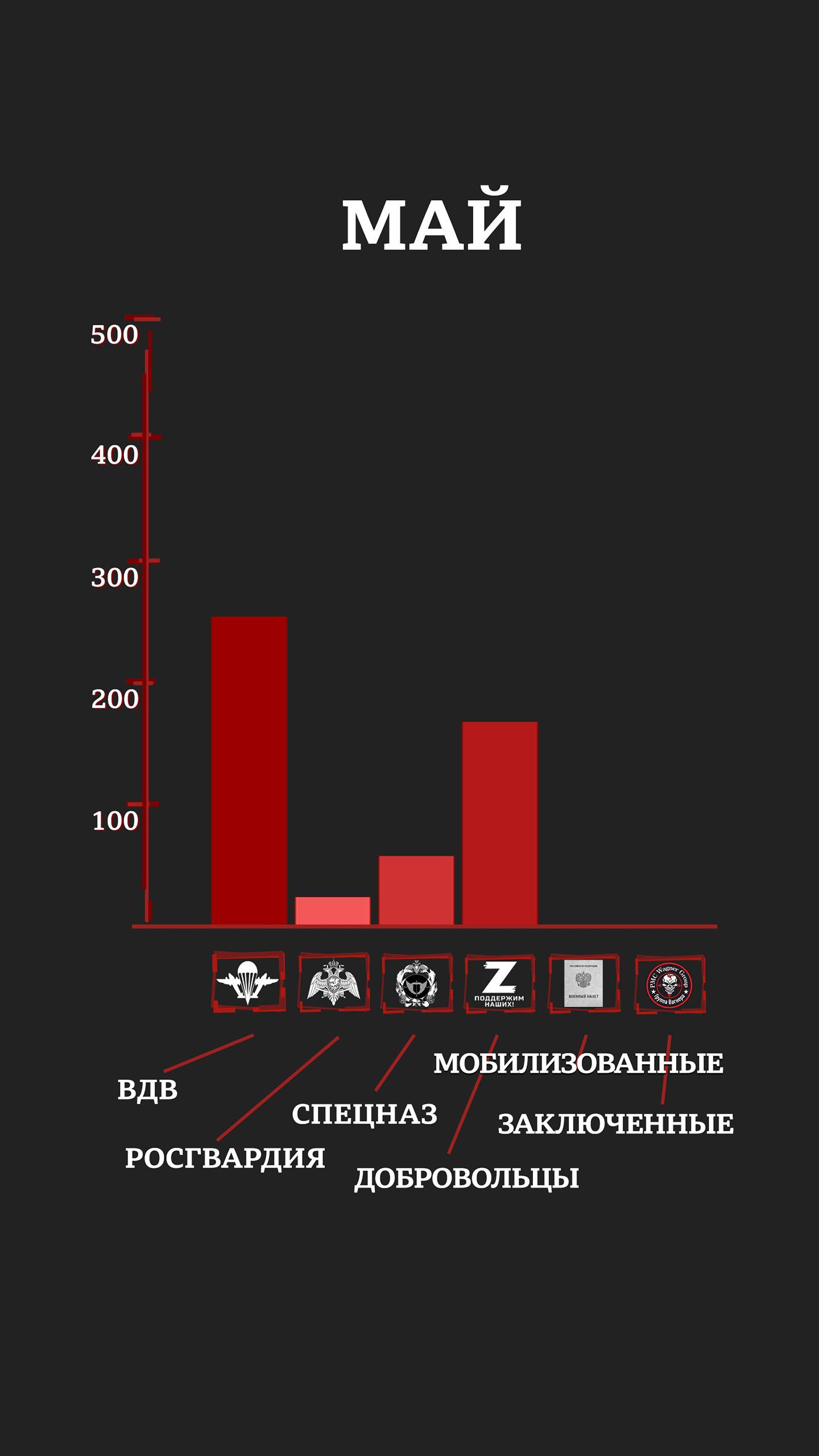 С учетом раненых и пропавших без вести уже к маю элитные отряды российской армии и Росгвардии имели в строю лишь четверть своего февральского состава (исходя из оценок специалистов и публиковавшейся численности отрядов). Средний возраст погибших в первые месяцы войны был 20-25 лет.