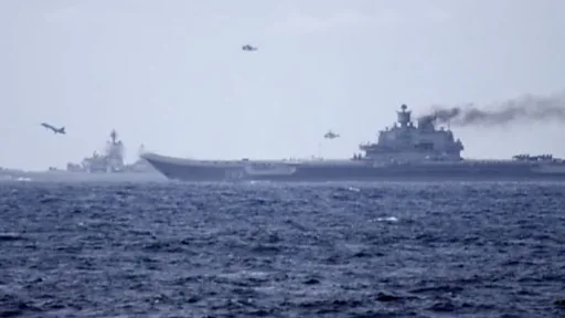 Два самых крупных российских боевых корабля - авианесущий крейсер, флагман Северного флота "Адмирал Кузнецов" и самый мощный надводный корабль, атомный ракетный крейсер "Петр Великий" в сопровождении больших противолодочных кораблей "Североморск" и "Вице-адмирал Кулаков", а также судов обеспечения торжественно проследовали через Ла-Манш перед объективами теле- и фотокамер.