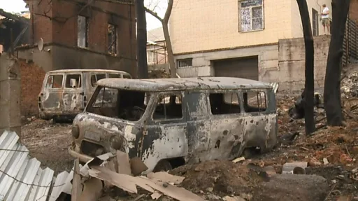 Через дорогу - дом, хозяевам которого повезло чуть больше остальных - стены и крыша остались целы. Владелец осматривает повреждения. Его жена ходит по двору и кормит ребенка грудью. Рядом с ними тяжело хромает собака, ее лапы разъезжаются по земле - явно сильно пострадала при пожаре, проходящий мимо спасатель замечает: "Инсульт, что ли?"