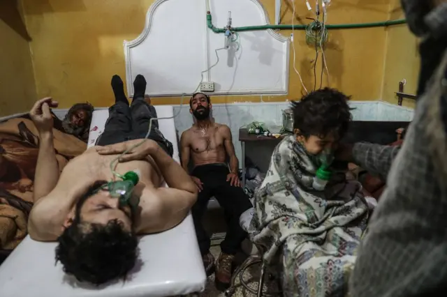 Снимок Мохаммеда Бадры называется "Жертвы предполагаемой атаки в Восточной Гуте лечатся". Фотография сделана в Шифуниехе в феврале 2018 года. Во время решающего штурма пригорода Дамаска жители Восточной Гуты подверглись массовым обстрелам и предположительно как минимум одной газовой атаке.