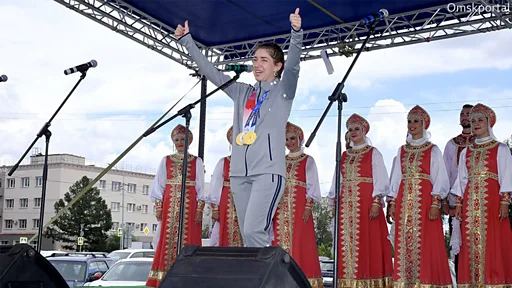 По приезде в родной Омск девушку встретили чиновники и русский народный хор, исполнивший песню "Ведьмаку заплатите чеканной монетой". Бацарашкина смеялась и подпевала, стоя в толпе встречающих.