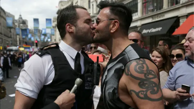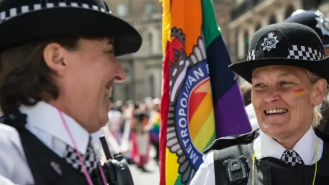 В этом году парад проходил при усиленных мерах безопасности. По меньшей мере двое полицейских воспользовались этим поводом, чтобы сделать предложение своим партнерам. Британия легализовала гей-браки в 2014 году, а однополые гражданские партнерства в стране можно заключать с декабря 2005 года.