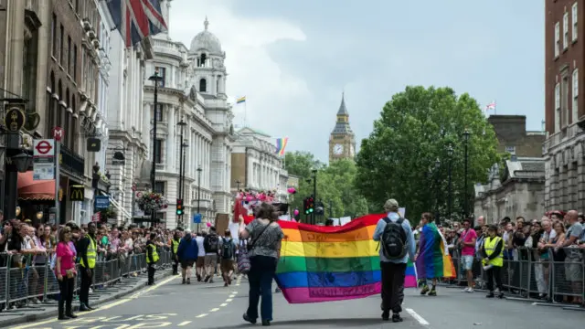 На несколько дней перед проведением прайда радужный флаг - символ борьбы ЛГБТ за равноправие - заменил государственный "Юнион Джек" на нескольких правительственных зданиях. Впервые он был поднят и над зданием британского парламента.