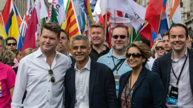 Шествие, проходящее уже 43-й год подряд, возглавил недавно избранный мэр Лондона Садик Хан (на фото в центре).