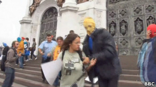 Люди в штатском - как предполагают, охранники храма - попытались пресечь акцию. Они применяли грубую физическую силу по отношению не только к активистам, но и журналистам, освещавшим акцию.