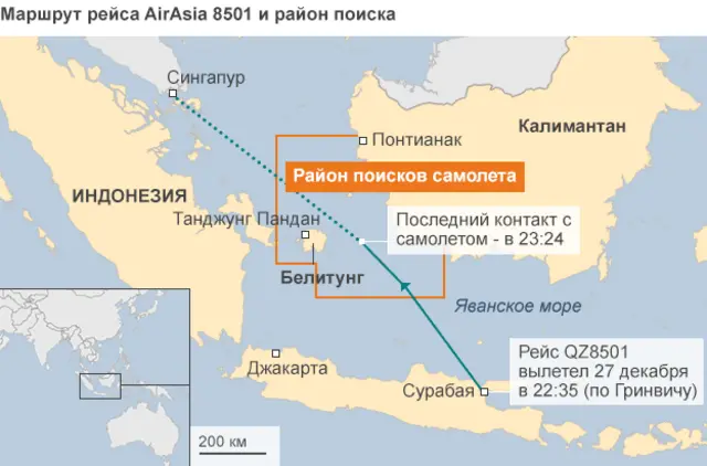 Лайнер, совершавший рейс под номером QZ8501 из индонезийской Сурабаи в Сингапур, потерял связь с наземными службами в Джакарте в 07:24 утра по местному времени (23:24 по Гринвичу).