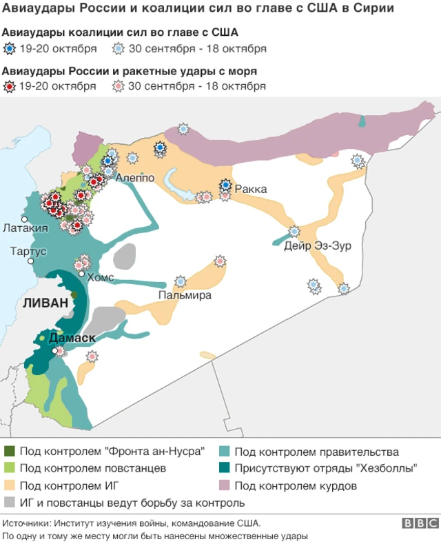 Но основное количество авиаударов приходится на районы, контролируемые различными оппозиционными Асаду группами – как исламистами, так и умеренными повстанцами, поддерживаемыми Западом.