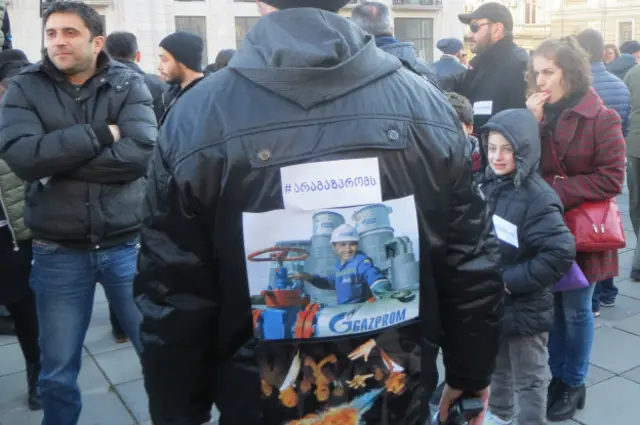 "Мы помним, каким оружием являлся российский газ, когда мы от него зависели. В 2006 году это было прямым шантажом, когда Грузии прекратили подачу газа. То же оружие было использовано против Украины, против Европы. То есть для Путина "Газпром”- это то же самое, что вооруженные силы или спецслужбы. Для него это оружие для воздействие на страны, которые не хотят в политическом смысле ему подчиняться", - сказал Би-би-си депутат от Единого Национального Движения Георгий Габашвили, который также пришел на субботнюю акцию.