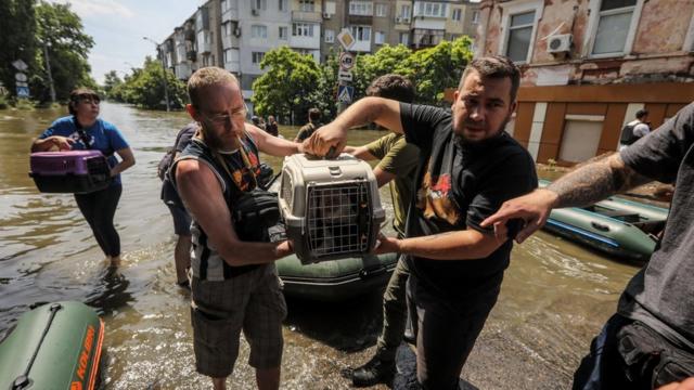 В четверг, по словам главы Херсонской администрации, удалось эвакуировать из зоны бедствия около 2000 человек. Российские госСМИ приводят цифру в 4300 эвакуированных из области.