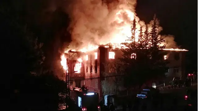 На съемках, показанных по турецкому телевидению, можно увидеть охваченное огнем трехэтажное здание и пожарных, которые пытаются потушить пламя.
