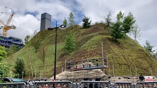 Холм сделан из металлических конструкций, которые покрыты газоном с небольшими деревьями, так что, по планам создателей, когда трава и деревья полностью приживутся, холм будет выглядеть как настоящий, только не природный, а, скорее, такой, какие насыпали по всей Англии завоеватели-норманны и строили на их вершинах крепости.