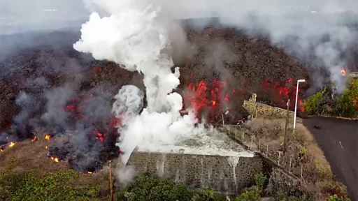 Потоки лавы, которые образовались в результате извержения вулкана Кумбре-Вьеха на испанском острове Пальма, добралась до океана. Эксперты опасаются, что в результате контакта раскаленной докрасна лавы с водой могут образоваться ядовитые газы.