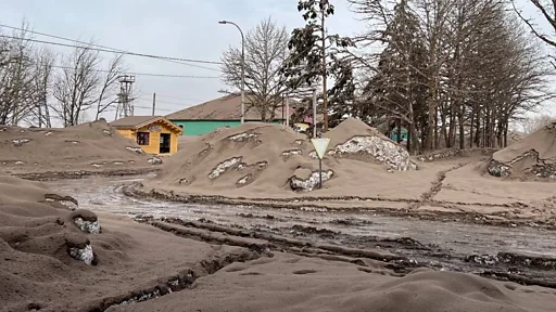 Мощное извержение вулкана Шивелуч произошло в ночь на 11 апреля на Камчатке. Вулканический пепел накрыл плотным слоем ближайшие населенные пункты.
