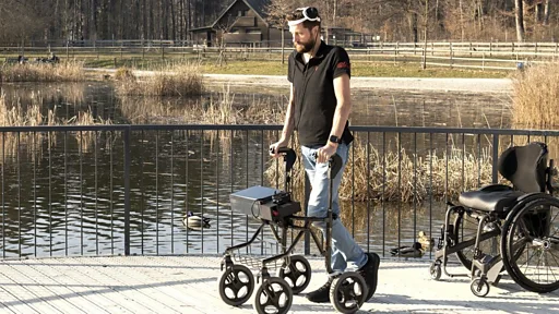 Через несколько недель тренировок исследователи выяснили, что парализованный мужчина может не только стоять на ногах, но и передвигаться, правда, с помощью ходунков.
