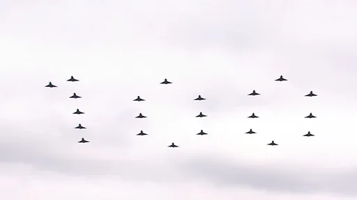 Вслед за парадом военных, прошедших маршем по улице Мэлл, ведущей к дворцу, около сотни самолетов, использовавшихся в Королевских ВВС все эти годы, пролетели над Лондоном.