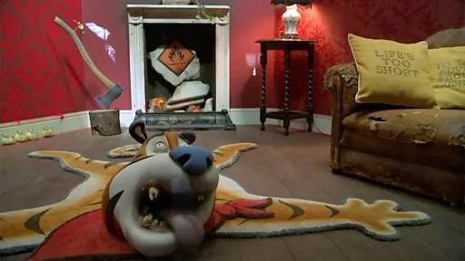 На полу есть коврик с тигром Тони - символом хлопьев Frosties, - топор, воткнутый в пень, и люлька в окружении камер наружного наблюдения.