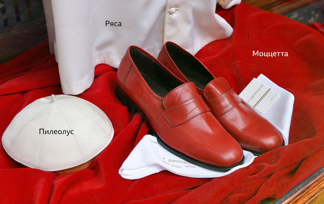 После того, как новый папа объявляет свое новое имя, его препровождают в так называемую «комнату слез», помещение за Сикстинской капеллой, где его в первый раз облачают в папские одежды: белую рясу, моццетту (короткую красную накидку с капюшоном), и традиционный головной убор – пилеолус, или белую шапочку, состоящую из восьми треугольных клиньев.