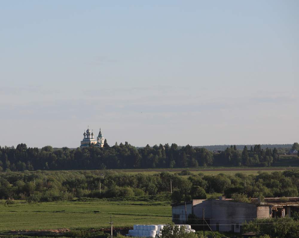 Сверху открывается панорама: бесконечные поля, холмы, вдалеке маковка храма.