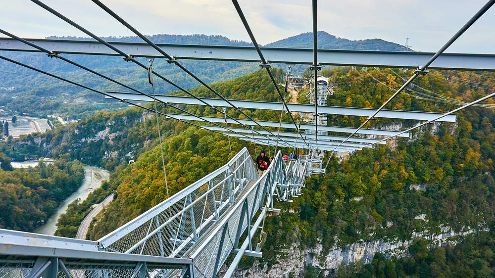 Из Адлера легко добраться до Красной Поляны — в вашем распоряжении три горных курорта: Роза Хутор, Горки Город и Газпром Сочи. Здесь вы можете прокатиться на канатных дорогах (2000 м над уровнем моря) или прыгнуть с моста в Skypark (длина 439 м, высота 207 м).