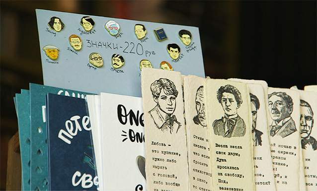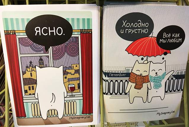 Здесь можно купить деревянные значки ручной работы с портретами русских писателей и поэтов, открытки и магниты с остроумным петербургским брендингом, посвященным, конечно, дождливой погоде и меланхолическому настроению жителей города.