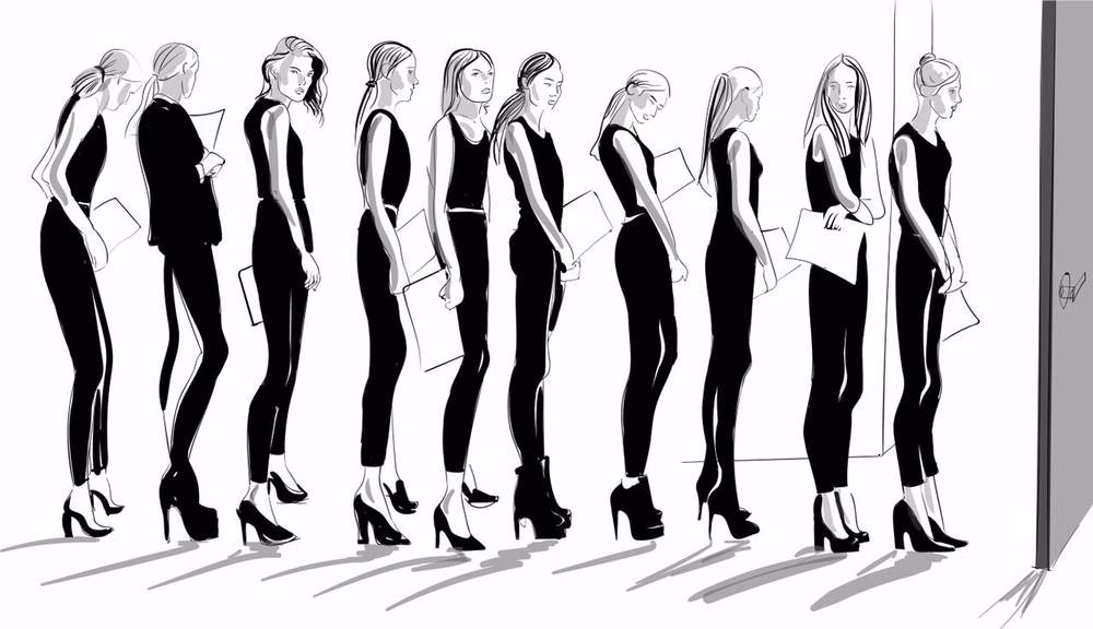 Худощавые, дрожащие от холода модели, каждая не ниже 175 сантиметров, толпятся перед закрытой железной дверью. На них лишь облегающие джинсы и тонкие майки на бретельках, на лицах – смесь растерянности и надежды. В руках у каждой композитка – карточка с фотографией и параметрами модели.
