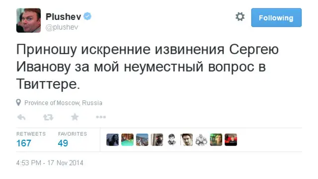"Приношу искренние извинения Сергею Иванову за мой неуместный вопрос в Твиттере", - написал Плющев в понедельник в своем микроблоге.