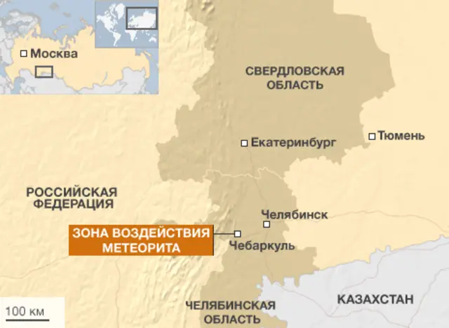 Взрыв метеорита над Челябинской областью произошел в пятницу примерно в 09:20 по местному времени (07:20 МСК), при этом во многих зданиях города лопнули стекла.