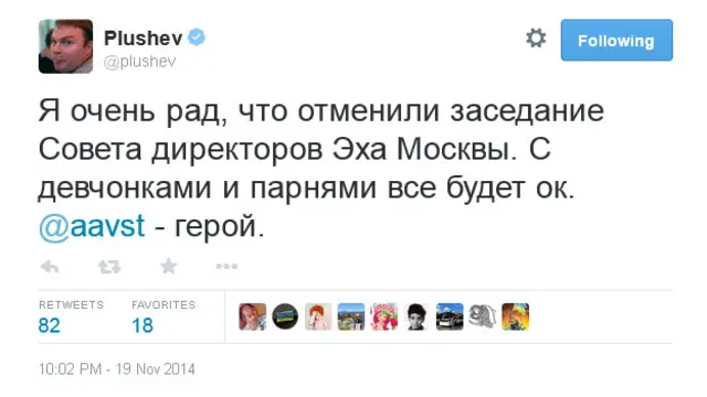 Главный редактор "Эха" Алексей Венедиктов счел, что увольнение незаконно, так как противоречит уставу радиостанции, и пообещал, что Плющев продолжит работу.