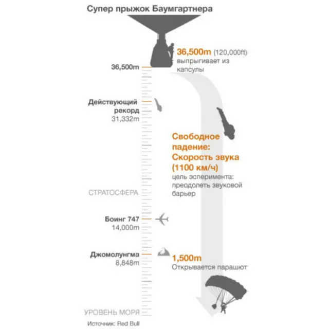 Падая с такой высоты в разреженной атмосфере, почти вакууме, он должен достичь скорости звука (1110 км/ч) в течение всего 40 секунд. Согласно плану, примерно через 10 минут полета Баумгартнер должен раскрыть парашют и приземлиться в пустыне в штате Нью-Мексико.