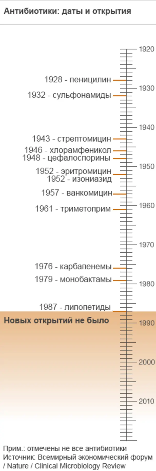Пик открытий новых антибиотиков пришелся на 50-е и 60-е годы прошлого века, но с 1987 года не было создано ни одного нового препарата этого вида.
