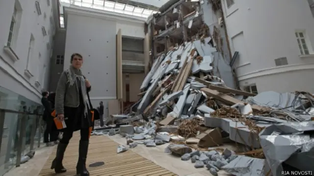 В огромный, сохранивший классические формы здания и превращенный в залитый естественным светом атриум немец Томас Хиршхорн умело вписал инсталляцию из деталей то ли только что снесенного, то ли, наоборот, строящегося дома. Этот "искусственный" мусор одновременно и контрастирует с архитектурой, и дополняет ее, подчеркивая свежесть недавно отреставрированного нового музея.
